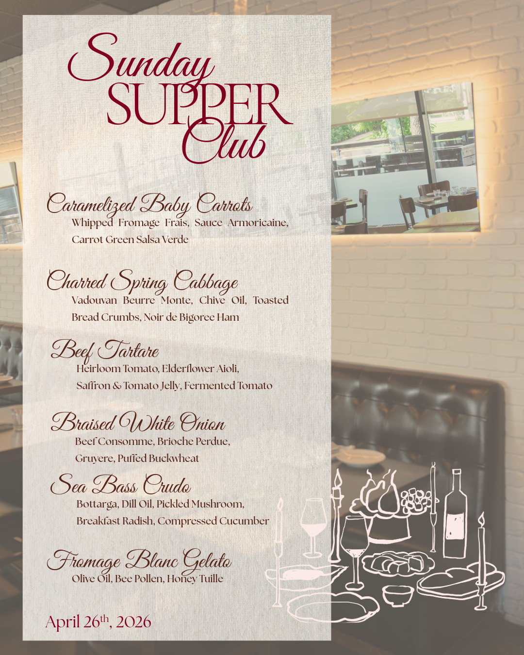 Each Sunday Supper Club will still feature a unique theme. What remains constant is our commitment to bringing people together, fostering conversation, and creating a shared meal that feels both elevated and comforting.