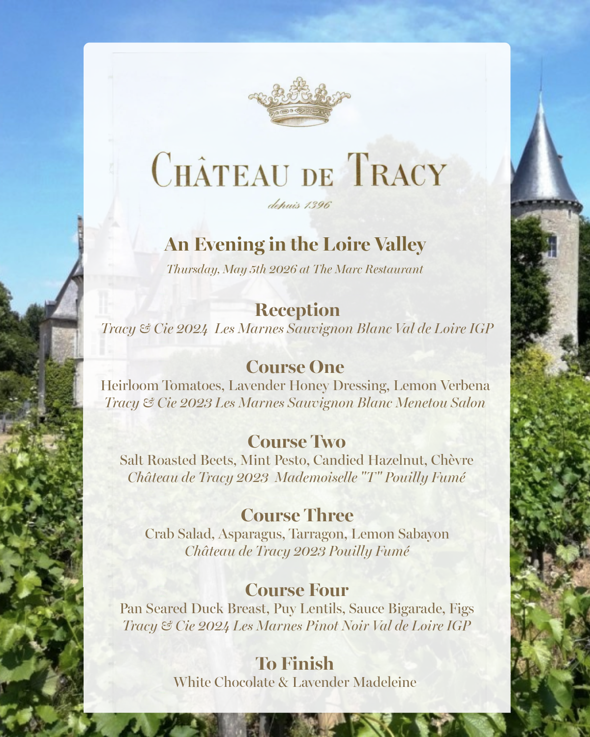 Transport yourself to the Loire Valley for an evening of discovery at The Marc. This four-course dinner is paired with five wines from Château Tracy, exploring the nuance of Sauvignon Blanc across Menetou-Salon and Pouilly-Fumé, with a final expression in Pinot Noir. The evening begins with a reception pour and unfolds into a guided culinary and wine experience that celebrates place, craftsmanship, and seasonality.